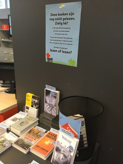 In de prullenbak zit een boek dat blijkbaar een miskoop was voor deze bieb.