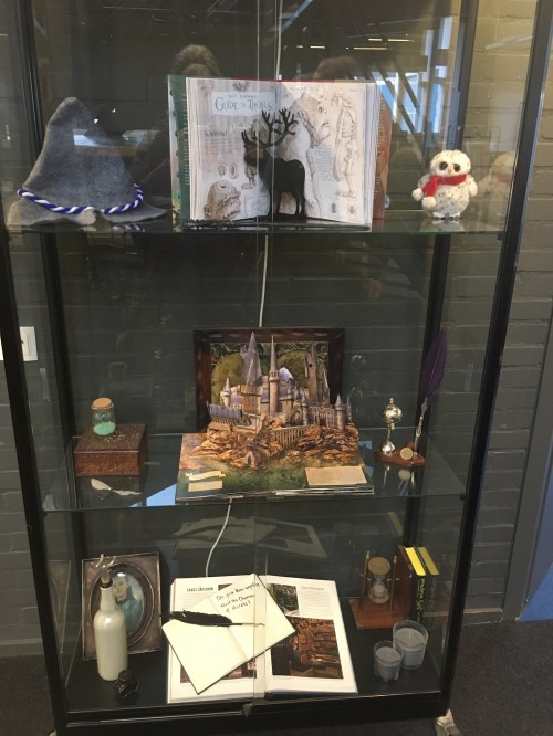 In een vitrine staan allemaal magische voorwerpen, met als blikvanger dat middelste uitklapboek met een kasteel, geweldig toch!