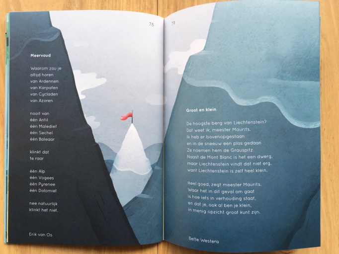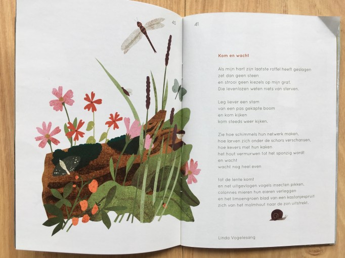 De poëzie van Radna Fabias, Roelof ten Napel en Vicky Francken vond ik nogal ondoorgrondelijk. Een gedichtendip lag op de loer, maar toen kwam Jannie met een prachtig eigen gedicht over een voetveer. En ergens onderaan mijn leesstapel zag ik een nummer van het poëzietijdschrift Dichter liggen, daar had ik wel zin in! Hierin staan toegankelijke gedichten ‘voor iedereen van 6 tot 106 jaar’. Een tijdje geleden had ik twee losse nummers besteld, met de thema’s bomen en wereld.