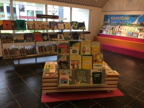 Bij de ingang staat deze vrolijke thematafel met vakantieboeken.