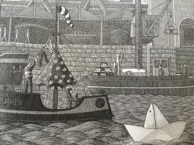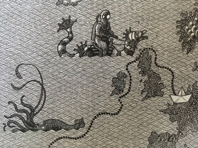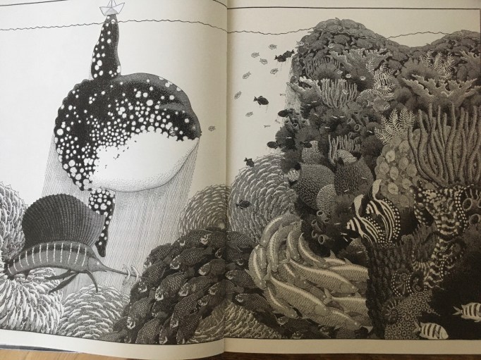 De eerste tekening staat op de schutbladen: voorin is dit een wereldkaart en achterin ook, maar dan met de reis van het papieren bootje ingetekend. Op de eerste bladzijde wordt dit bootje gevouwen. Het zwerft over de wereldzeeën. De tekeningen gaan voor een flink deel over wat onder water gebeurt, vol vissen en mysterieuze wezens.