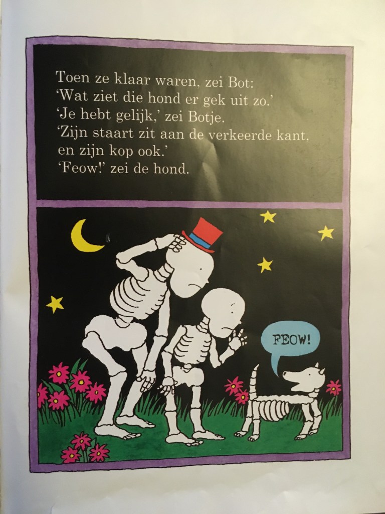 Het verhaal gaat over drie geraamtes, die in een donkere kelder wonen en ’s nachts naar buiten gaan. Het begin kon ik me nog herinneren: