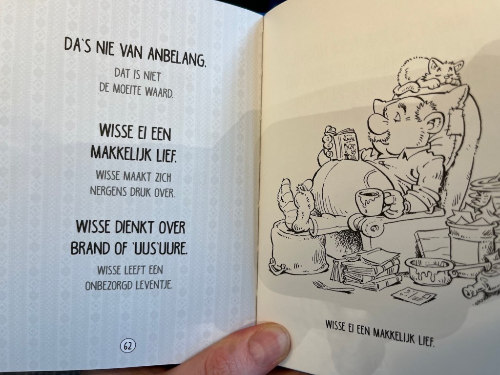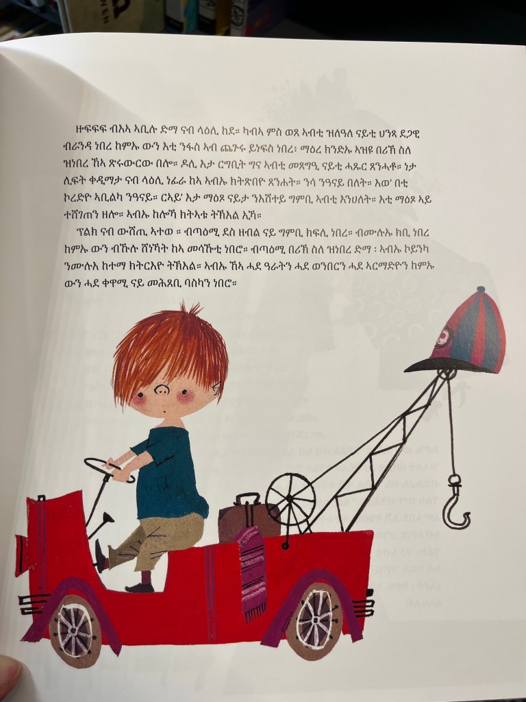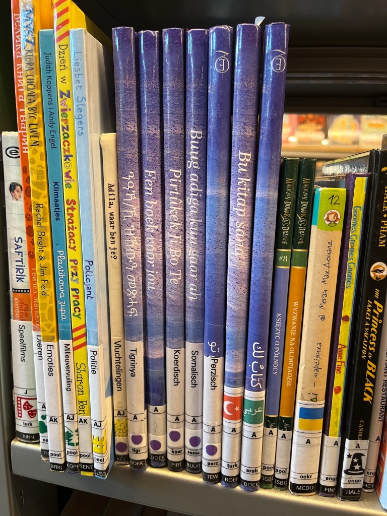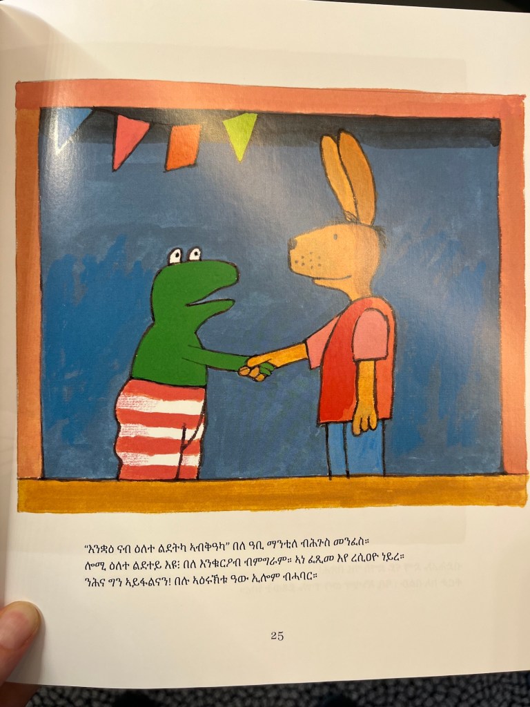 Voor meertalige kinderen zijn er boeken in diverse talen. Bijzonder is dit blauwe boek met fragmenten uit een aantal bekende Nederlandse kinderboeken. Zo zie je hier Kikker en Pluk in het Tigrinya, dat wordt gesproken in Eritrea.