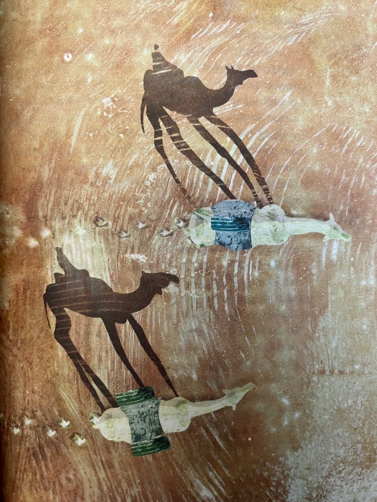 In de reisverhalen is er speciale aandacht voor diverse dieren. Natuurlijk zijn er de paarden en kamelen waarop ze reizen, maar ook allerlei bijzondere dieren die ze onderweg tegenkomen. Ik vind het mooi dat Lida Dijkstra laat doorschemeren dat er verschillende manieren zijn waarop je als mens met dieren kunt omgaan en dat het juist de jonge Topina is die daar oog voor heeft. Marco maakt tekeningen van de vreemde dieren, die voor het boek gemaakt zijn door Djenné Fila. Haar afbeeldingen zijn zo mooi en kunstzinnig. De mysterieuze sfeer van de verre landen is er goed in te zien.