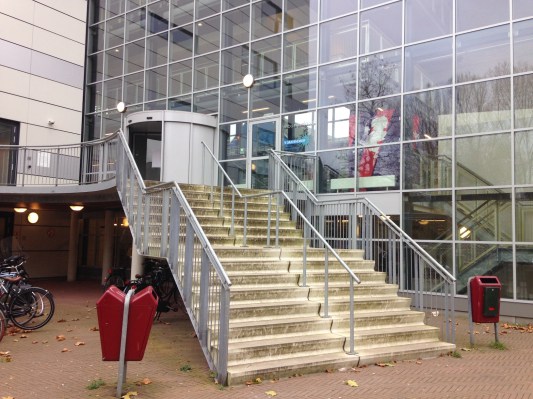 Ik zie een ouder stel de trap op gaan en kijk, daar is heel klein het logo van de bibliotheek. Deze bieb zit bij een mbo-school in het gebouw! Zou dat de scholieren stimuleren om vaker een boek te lezen?