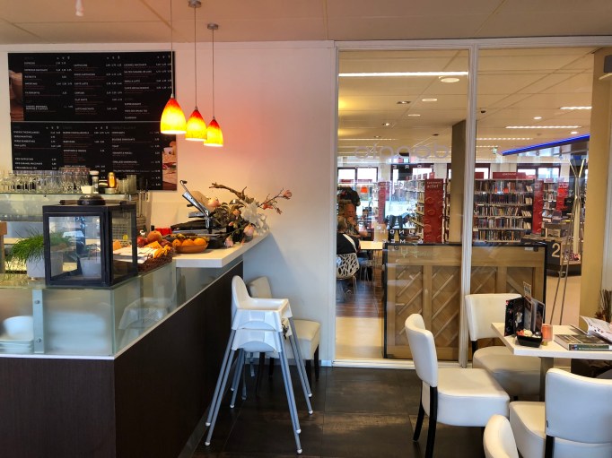 Onderweg naar huis vanaf ons vakantie-adres in Noord-Groningen drinken we koffie in Drachten. De Doppio grenst daar aan de bibliotheek, een ideale combinatie.
