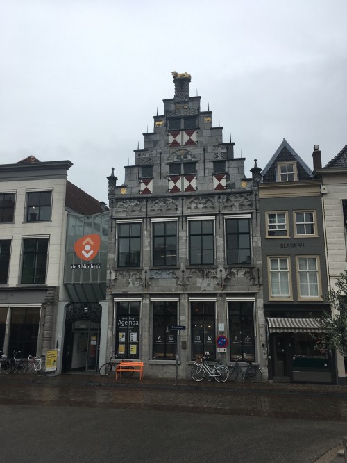 In Zutphen kan je sinds kort met het Gilde een literaire stadswandeling maken. Op de website van het Gilde kan ik het niet vinden, maar via Senia (de organisatie voor leesgroepen) kunnen mijn moeder en ik mee met de allereerste keer dat deze wandeling werd gedaan. Onze gids is zeer goed voorbereid en leidt ons langs talloze straatgedichten en andere bijzonderheden, erg leuk! Natuurlijk komen we ook langs de openbare bibliotheek, waar we een kwartier mogen rondneuzen. Precies genoeg tijd voor mij om een paar foto’s te maken.
